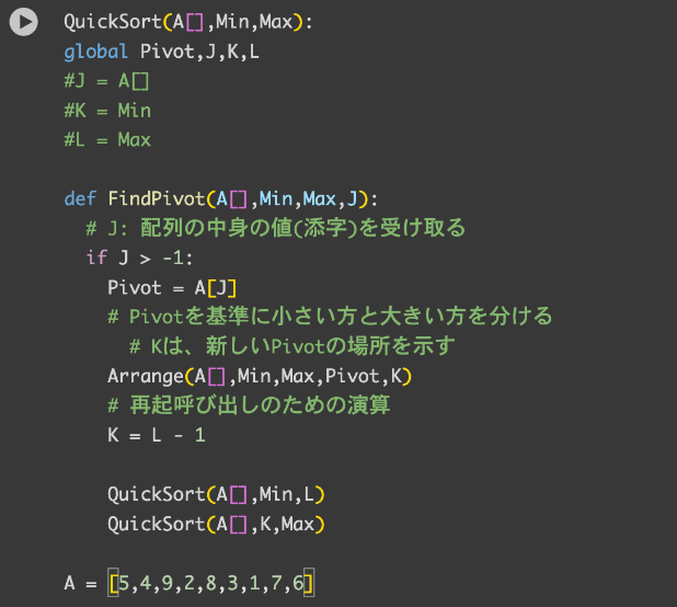 FindPivotメソッドには配列A,最小値Min,最大値Max,配列の中身(添字)を受け取るJが引数として渡されています。