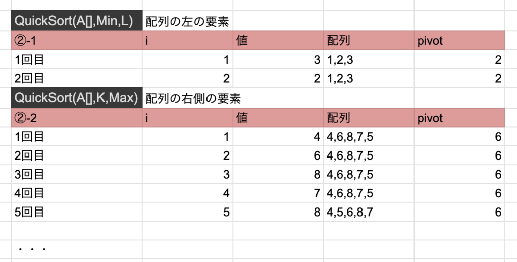Pivotはそれぞれ2と6になるので、Arrange(A[],Min,Maax,Pivot,K)の”K”はPivotの新しい場所を示します。