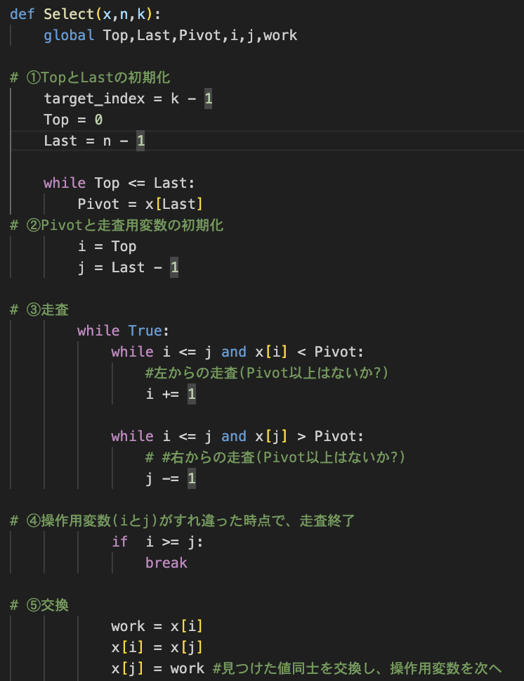 ここで、左右でPivot以上(or以下)はないかを走査します。