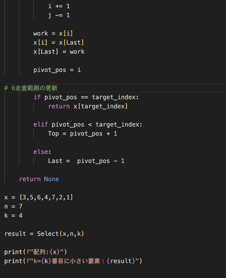 2回目の処理で pivot_pos=3 が目標 k=3 と一致したため、関数は終了し、x[3] の値 2 が返されます。よって、(c)の解はイです。