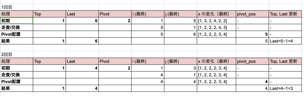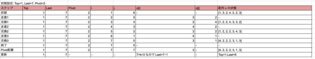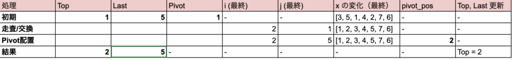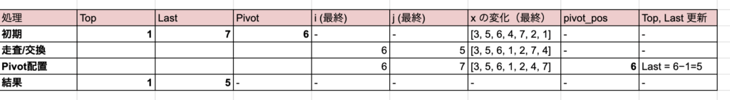 TopとLastの初期化を行います。Topは0,Lastは6ですね。(疑似言語では、”開始値=1″です)