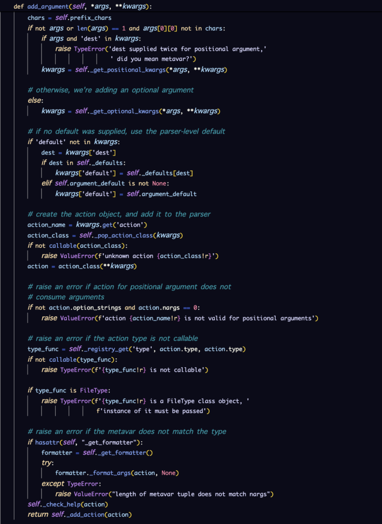 self.prefix_chars(デフォルトは -)を取得し、args[0][0](引数の1文字目)がそれに含まれるかを if 文で判定しています。含まれなければ「位置引数(positional)」、含まれれば「オプション引数(optional)」として、それぞれ別の内部メソッドへ処理を飛ばしています。