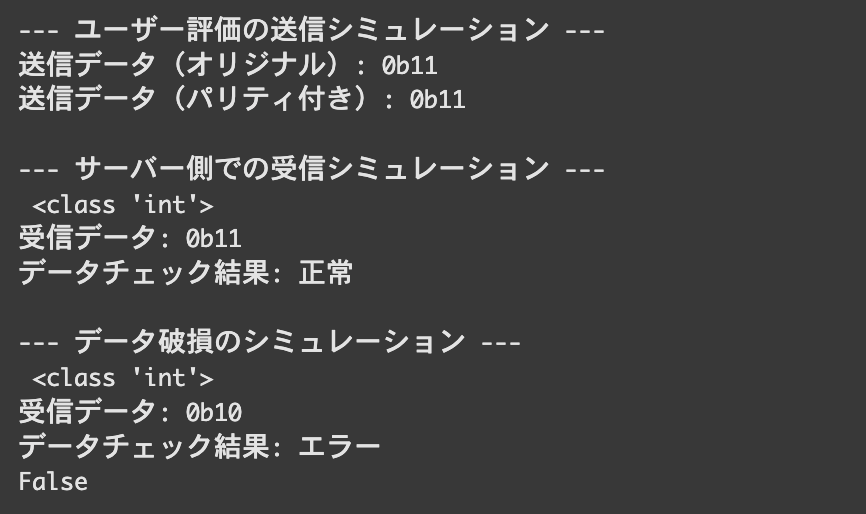 このように、たった1ビットの変化でも、パリティチェックによってエラーが検出されるのがわかります。