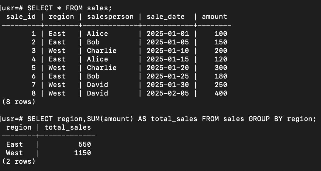 GROUP BY 句は、複数の行を特定の列(例: region)でグループ化し、そのグループに対して集約関数(SUM, AVG, COUNTなど)を適用して一行にまとめる機能です。