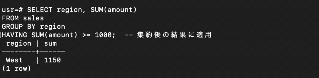 HAVING 句は、GROUP BY によって集約されたグループに対して条件を適用し、フィルタリングを行うために使われます。
