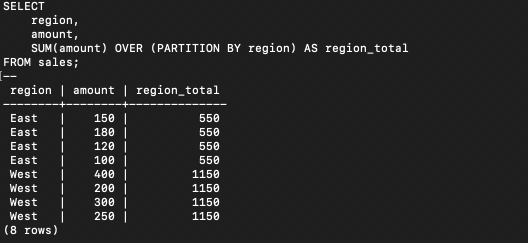 ウィンドウ関数は、OVER 句で定義された行の集合(ウィンドウ)に対して計算を行います。その計算結果は、元の各行に新しい列として付加されます。